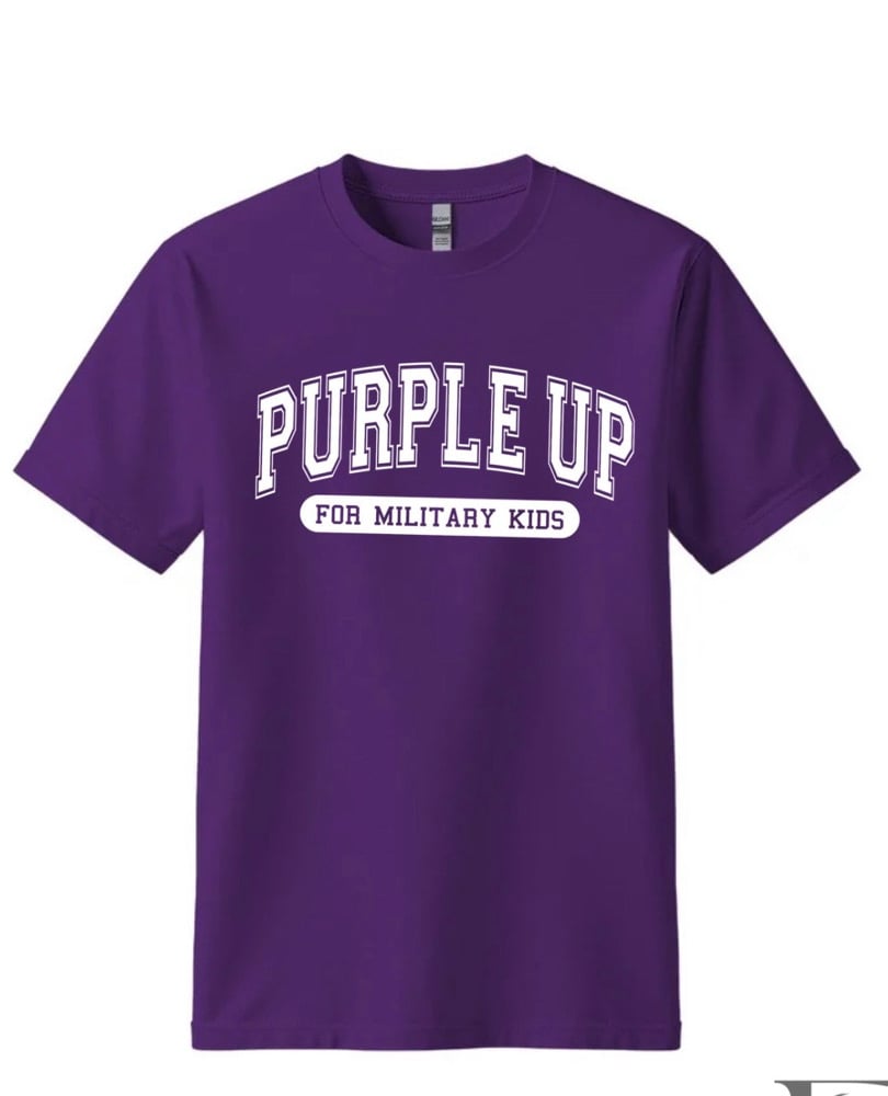 Show your support in timeless style with this bold collegiate-inspired tee. Featuring “Purple Up” in strong varsity lettering, this design keeps it simple while making a powerful statement for military kids everywhere. Perfect for school events, community gatherings, or everyday wear.