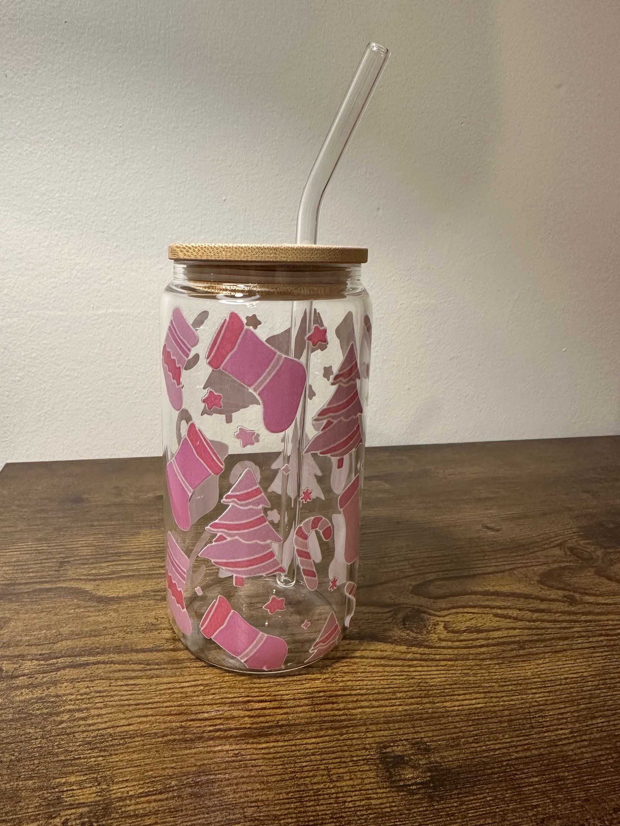 Sip in festive style with this adorable 16oz holiday glass can cup! Featuring a charming pink holiday design with stockings, trees, candy canes, and stars, this cup is perfect for adding a cozy, cheerful touch to your favorite drinks. Made from durable clear glass and paired with a natural bamboo lid and reusable glass straw, it’s both stylish and eco-friendly.